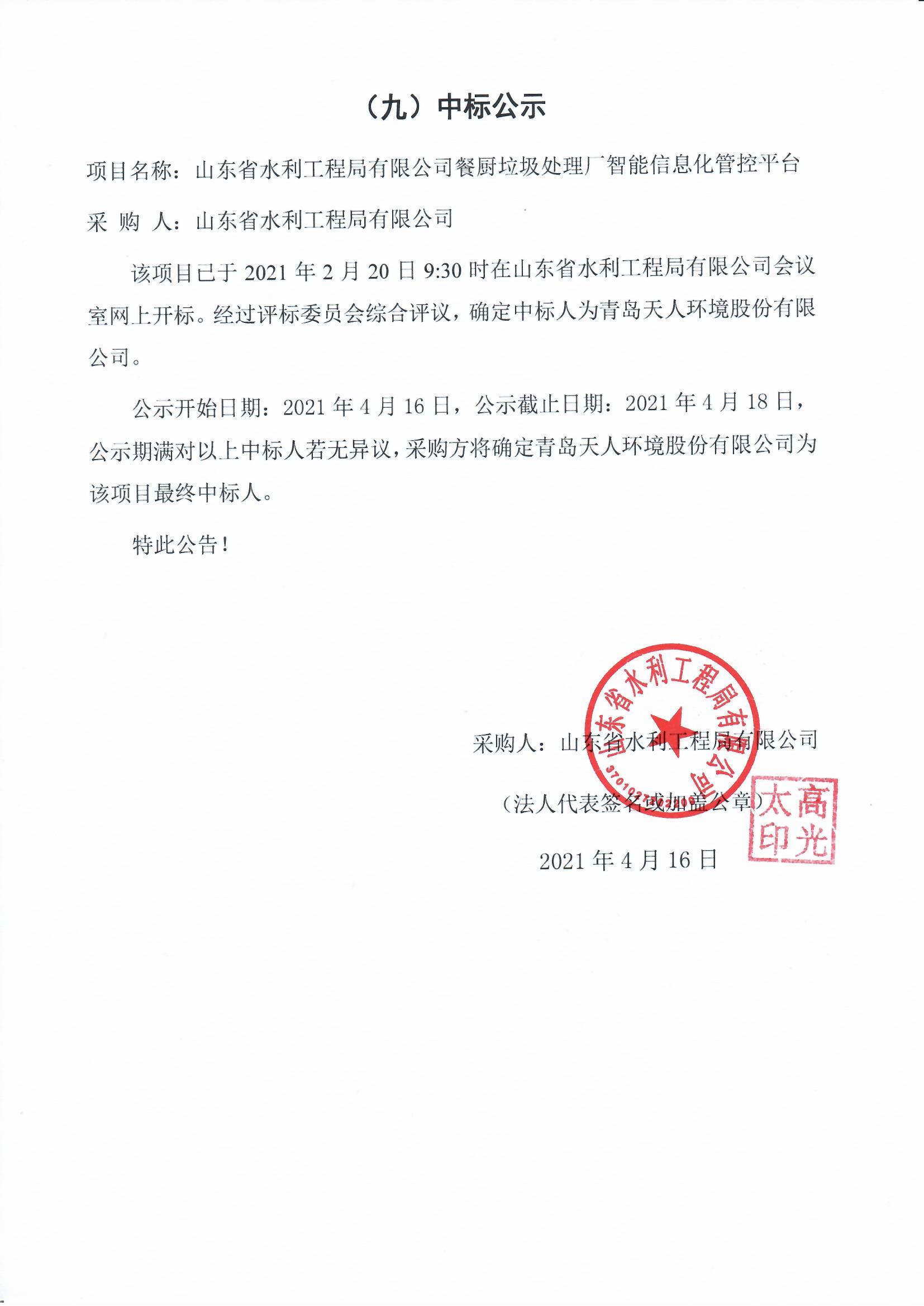 山東省水利工程局有限公司餐廚垃圾處理廠智能信息化管控平臺中標(biāo)公示
